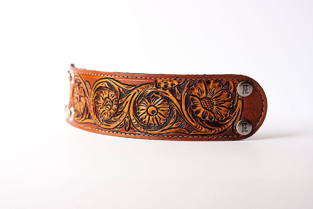 Zaczęliśmy od wysokiej jakości skóry garbowanej roślinnie, wytłoczyliśmy piękny kwiatowy wzór, wybarwiliśmy i wykończyliśmy skórę, podszyliśmy ją czarnym zamszem świńskim (dla zapewnienia wyjątkowego komfortu) i wykończyliśmy trwałym ściegiem.
